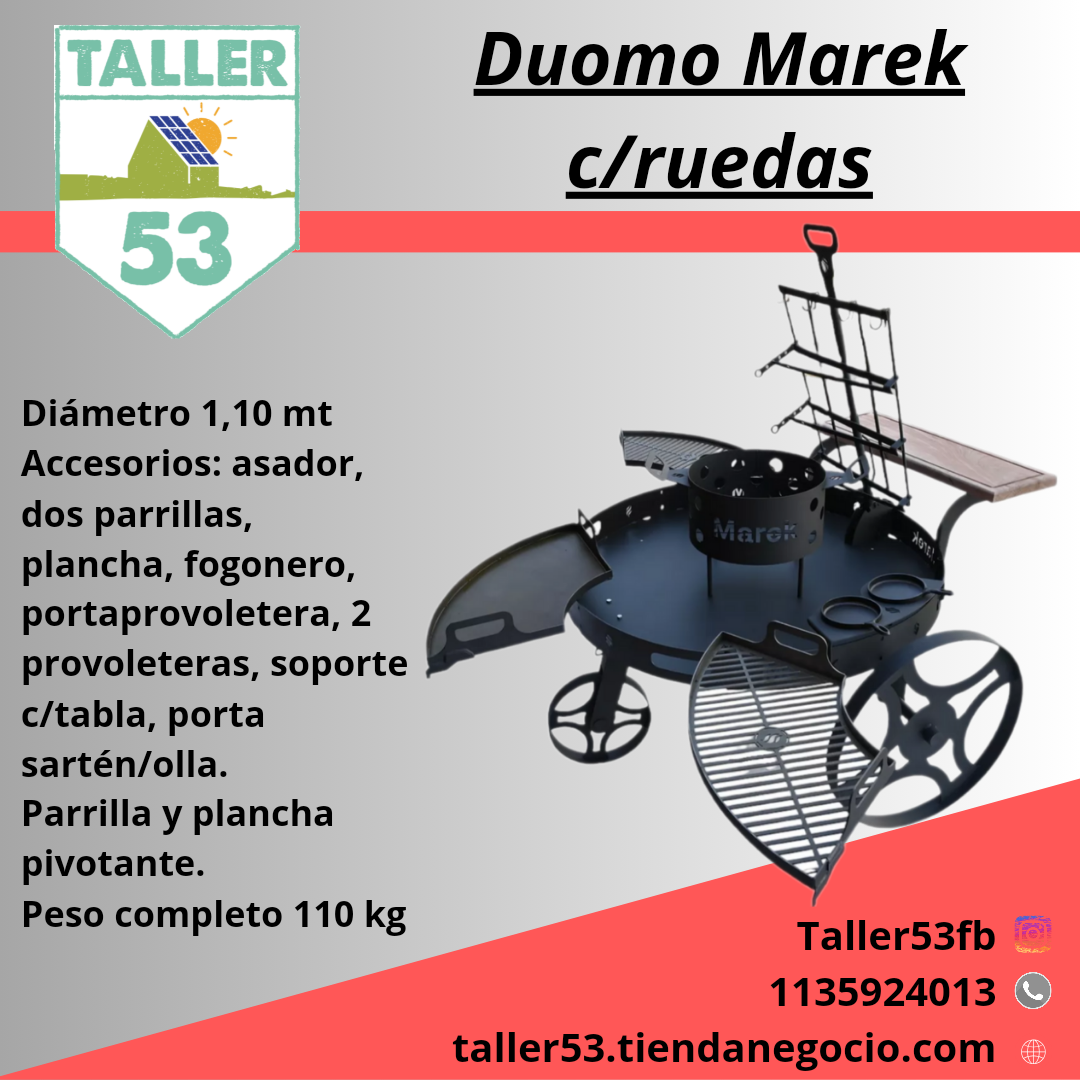 - Todos los accesorios incluidos: 1 asador, 2 parrillas, 1 plancha, 1 brasero central, 1 porta provoletera, 2 provoleteras, 1 soporte con tabla y 1 soporte para ollas y sartenes.